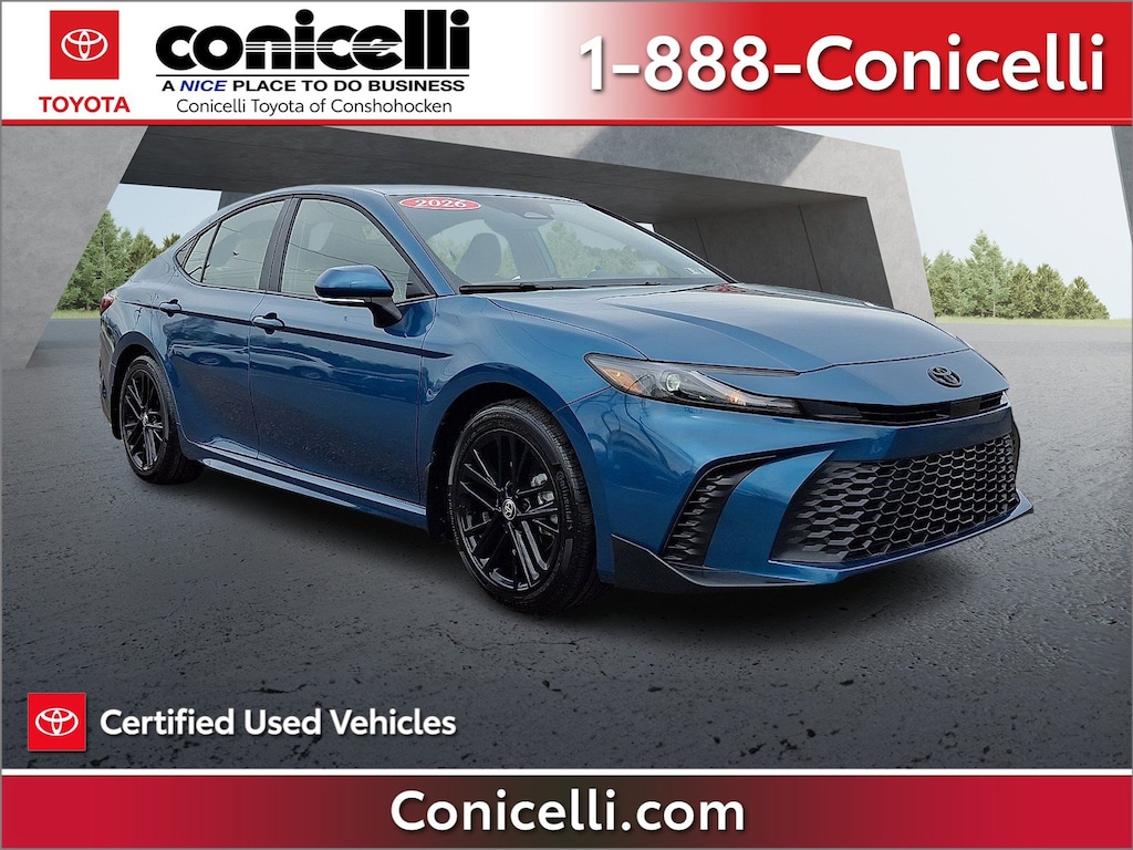 CarFax One Owner! -Priced below the market average!- This Toyota Camry is CERTIFIED! Low miles for a 2026! Back-up Camera, Bluetooth, Multi-Zone Air Conditioning, Auto Climate Control, Leather Steering Wheel Satellite Radio, Steering Wheel Controls, HD Radio Aux Audio Input, Automatic Headlights Keyless Start AM/FM Radio Rear Spoiler, This Toyota Camry gets great fuel economy with over 47.0 MPG on the highway! Stability Control, ABS Brakes Satellite Radio Front Wheel Drive Call to confirm availability and schedule a no-obligation test drive! We are located at 550 Ridge Pike, Conshohocken, PA 19428.